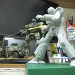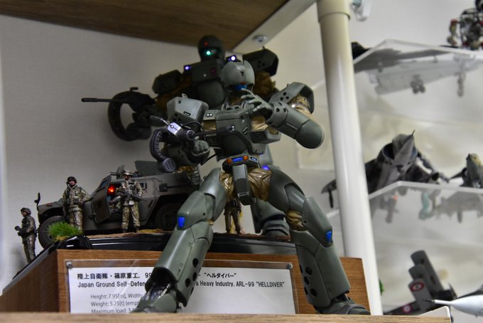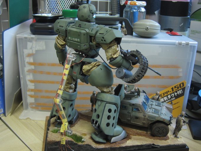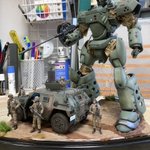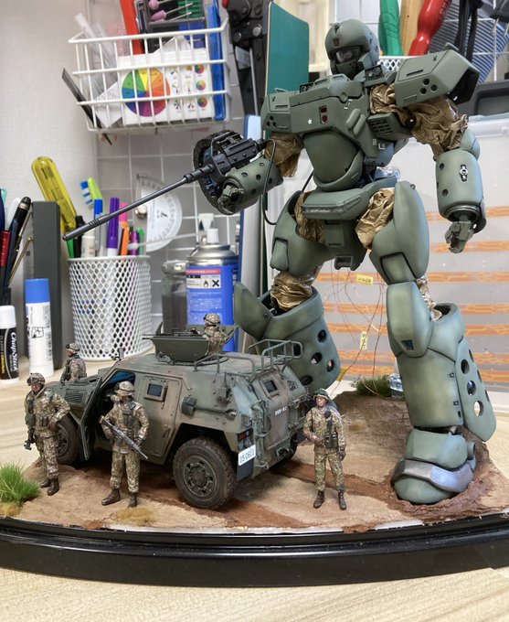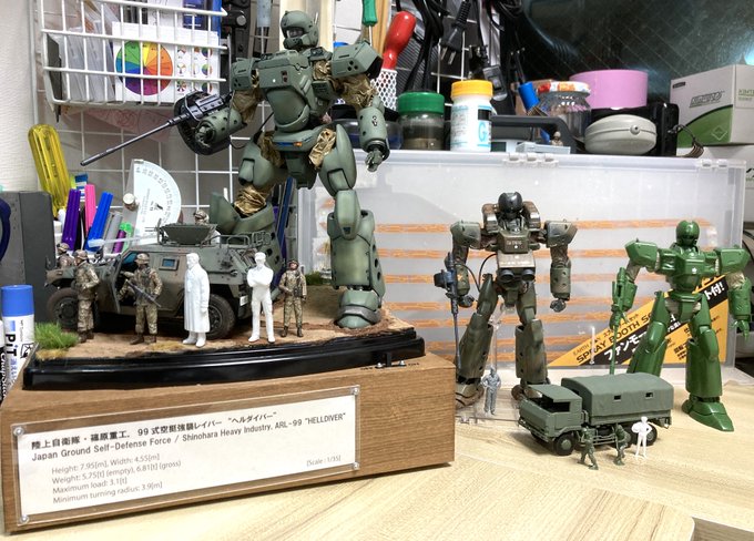 1/35スケールは色々な模型と並べられるのが楽しいねというコメントを頂いたので,他のスケールはどうかと思い1/60キットとアオシマ1/72トラックと付属の陸自隊員さんを置いてみました.ちょっとヘルダイバーが巨大化したかも.グッスマのヘルダイバーもいずれ試してみたいです. #パトレイバー模型部