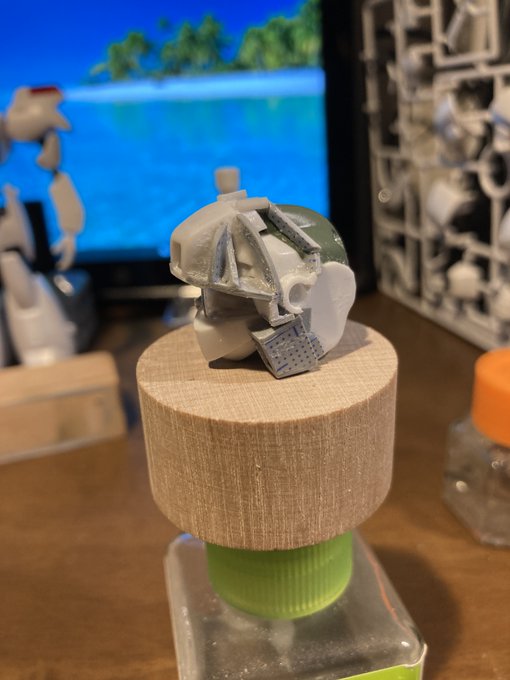 #個人的に今年1番頑張ったプラモデル見せてください 頑張り度合いでは間違いなくこれです.今年の元日に何となく思い立って,頭の製作を始めたのでした. スクラッチ成分がかなり多めのヘルダイバーですが,頭と肩がMGイングラム(2号機 劇2ver)なのでプラモの一種ということで.