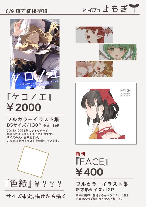23 141 ギリギリ報告ですが今週末の例大祭、せ29a「よもぎ」で参加します!持ち物は既刊のイラスト総集編と今描いてる色紙…!! 22/05/06 08:57
