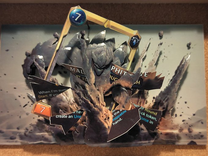 No.137 Malphite (Level 2) / LoR Altered Malphite's original art with card frame and exploding texts. Handmade with photopaper. Check out the movie in the thread to see it in detail. #ArtofLegends #LeagueOfLegends #LeagueOfLegendsFanArt #LegendsOfRuneterra @SkinSpotlights