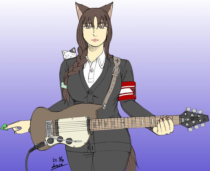 鮎咲さん@ayuzaki0 の水鳥ちゃんを描かせて頂きました。鮎咲さんファミリーは超久々! 最近音楽などで色々意見交換させて頂きまして、そのよしみです。 自分の趣味で帝国感全開の海軍衣装です、大幅に露出度減少という…… 彼女にはベースを持って貰いました。詳細部は紫電のギターも参考にしてたり。