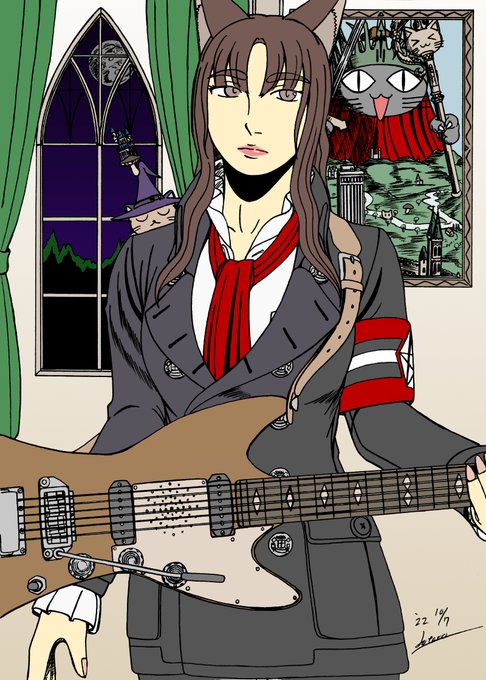 ハロウィンな季節なので、いつもより少しゴシック風な神崎さんです! またギター装備ですけど…… 髪もややウェーブ掛けました。 後ろのねこまんカイザーはちょっとしたネタです。 元ネタ分かる人居てくれたら嬉しいです。近代的高層ビルがあったり変な部分もありますが… #イラスト #創作 #うちのこ