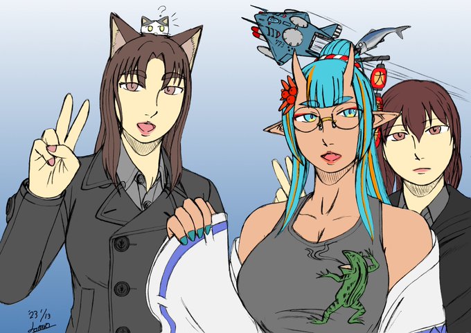 2 4 よっしゃ出来た!お待たせ致しました。 前回に続き彩色しました 竈七実ちゃん(@hasunohappa3) 大物ゲスト、やぶなかさん(@strcode_info) そしてうちの神崎さん。 当初七実ちゃんと神崎さんだけで描いてたんですけど、急遽やぶなかさんにも参戦頂いた次第です。 次の配信もお待ちしてます! #七実絵巻 23/01/13 18:21