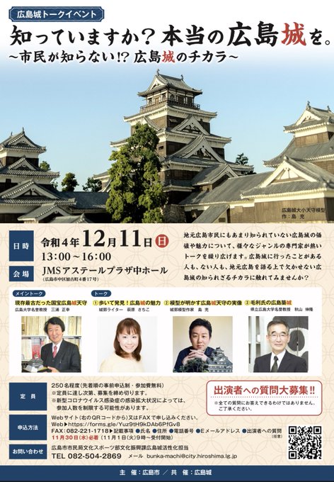 【お急ぎください】 12月11日の広島城トークイベントは既に定員250名に達しており、現在、定員を拡大して申し込み受付中だそうです。 打ち切りの可能性もありますので、迷ってらっしゃる方、お申し込みまだの方、お早めにどうぞ! city.hiroshima.lg.jp/soshiki/46/303…