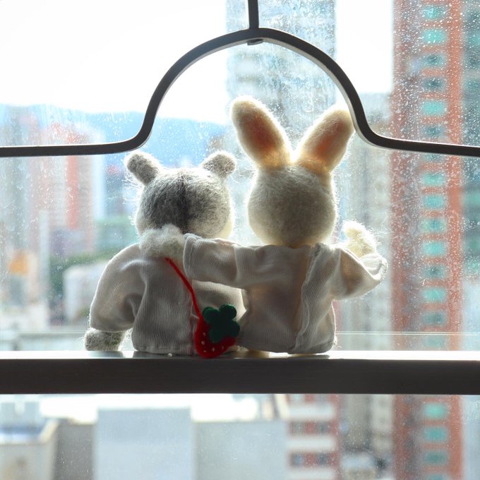 Best location to look at the blue sky and city. Ham Ham and Rabby miss going outside. The window is kinda dirty, need to clean up ! #hamhamandrabby #stayathome #lookatthesky #needlefelting #puppet #handcraft #羊毛フェルト #手作り雑貨