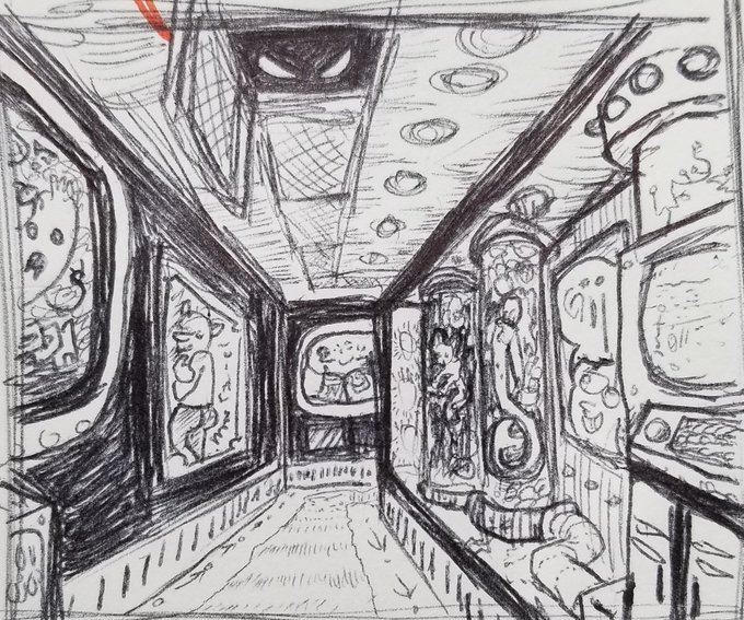 "Day 2" for inktober is a little spooky hallway scene, probably in some alien space station? Wanted to practice faking perspective and black placement while I was doodling. - - #art #doodle #drawing #traditionalart #ballpointpenart #inktober #alien #spooky