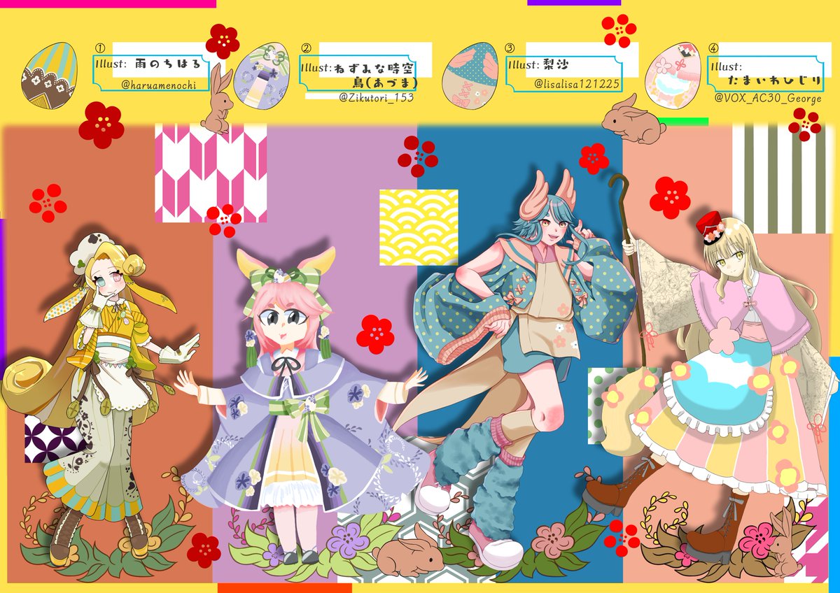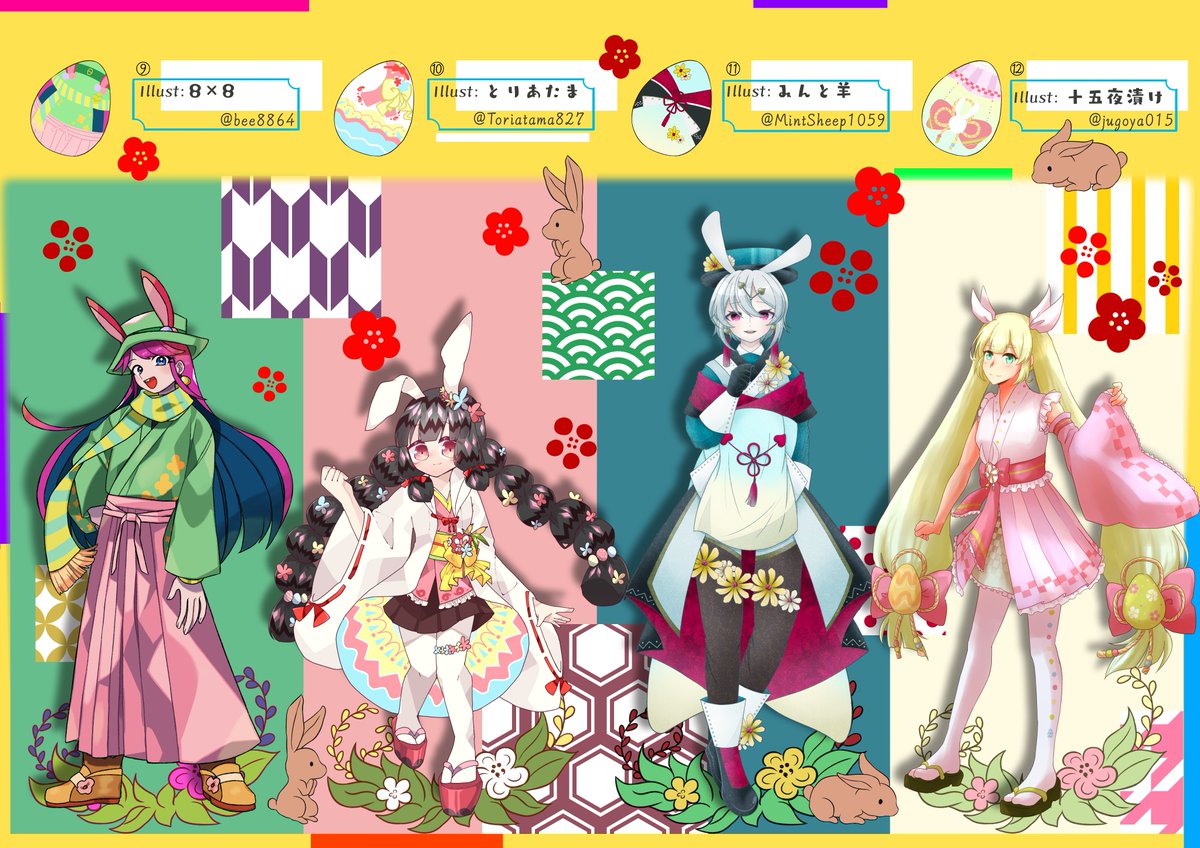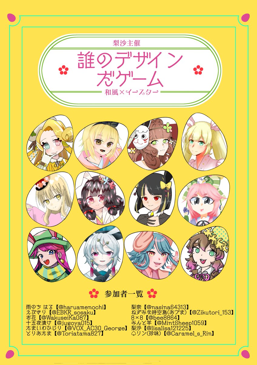 #誰のキャラデザだゲーム 梨沙さん(@ lisalisa121225 )主催の誰デザに参加させていただきましたー!! テーマは「和風×イースター」です🐰 私は⑫の子を描かせていただきました!私がデザインした子はどれでしょうか!リプにアンケート繋げるのでぜひ当ててみてください~!!