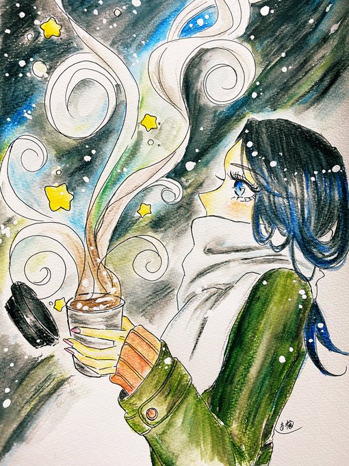 2 22 夜空のカフェラテ☕️ #イラスト #水彩色鉛筆 #アナログ #イラスト好きな人と繋がりたい #絵描きさんと繋がりたい 23/01/18 18:57
