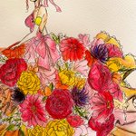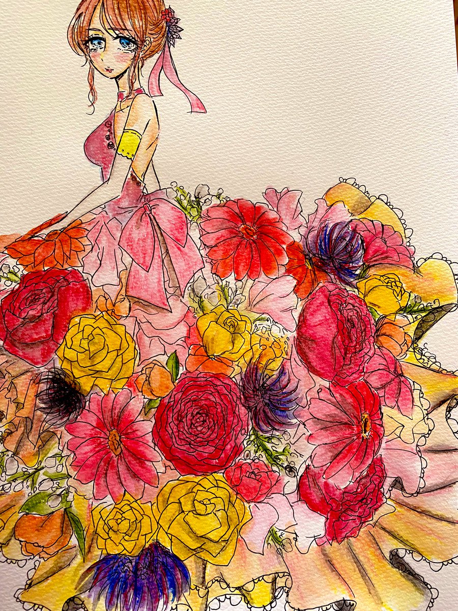 花束ドレス💐 #イラスト #アナログ #水彩色鉛筆 #イラスト好きな人と繋がりたい #絵描きさんと繋がりたい #絵柄が好みって人にフォローされたい