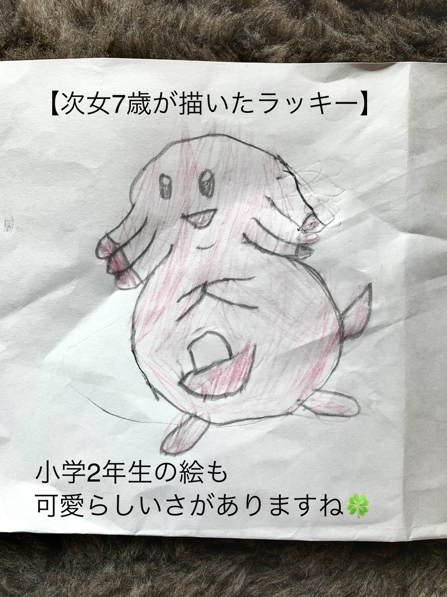 本日、次女7歳が私も描いたから、ツイッターに載せてほしいとの話があった😃 このポケモンは...⁉️ イラストは、子どもらしさの可愛い感じで、嬉しい気持ちになりました💕 本当にラッキーな日になりそうな予感🍀 #ラッキー #ポケモン #イラスト