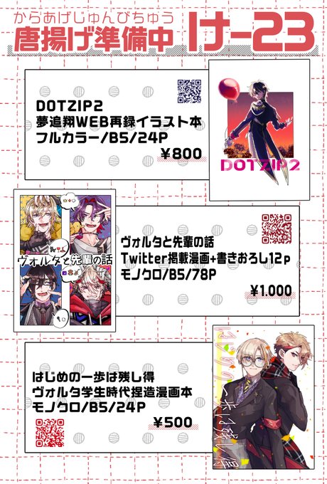 58 241 #にじそうさく07 け-23 唐揚げ準備中のお品書きです! ■夢追web再録イラスト本 ■ヴォルタと先輩の漫画 ■ヴォルタ学生時代ねつ造漫画 の三冊になります!!! ヴォルタ学生漫画にはじた【@ hukumori77】にゲストで一枚絵を寄稿頂いております! 間に合えば無配でドッグランドのポスカも 23/04/23 14:44