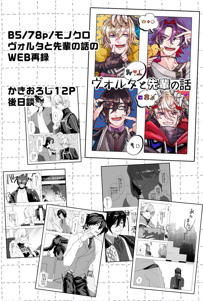 #にじそうさく07 け-23 唐揚げ準備中のお品書きです! ■夢追web再録イラスト本 ■ヴォルタと先輩の漫画 ■ヴォルタ学生時代ねつ造漫画 の三冊になります!!! ヴォルタ学生漫画にはじた【@ hukumori77】にゲストで一枚絵を寄稿頂いております! 間に合えば無配でドッグランドのポスカも