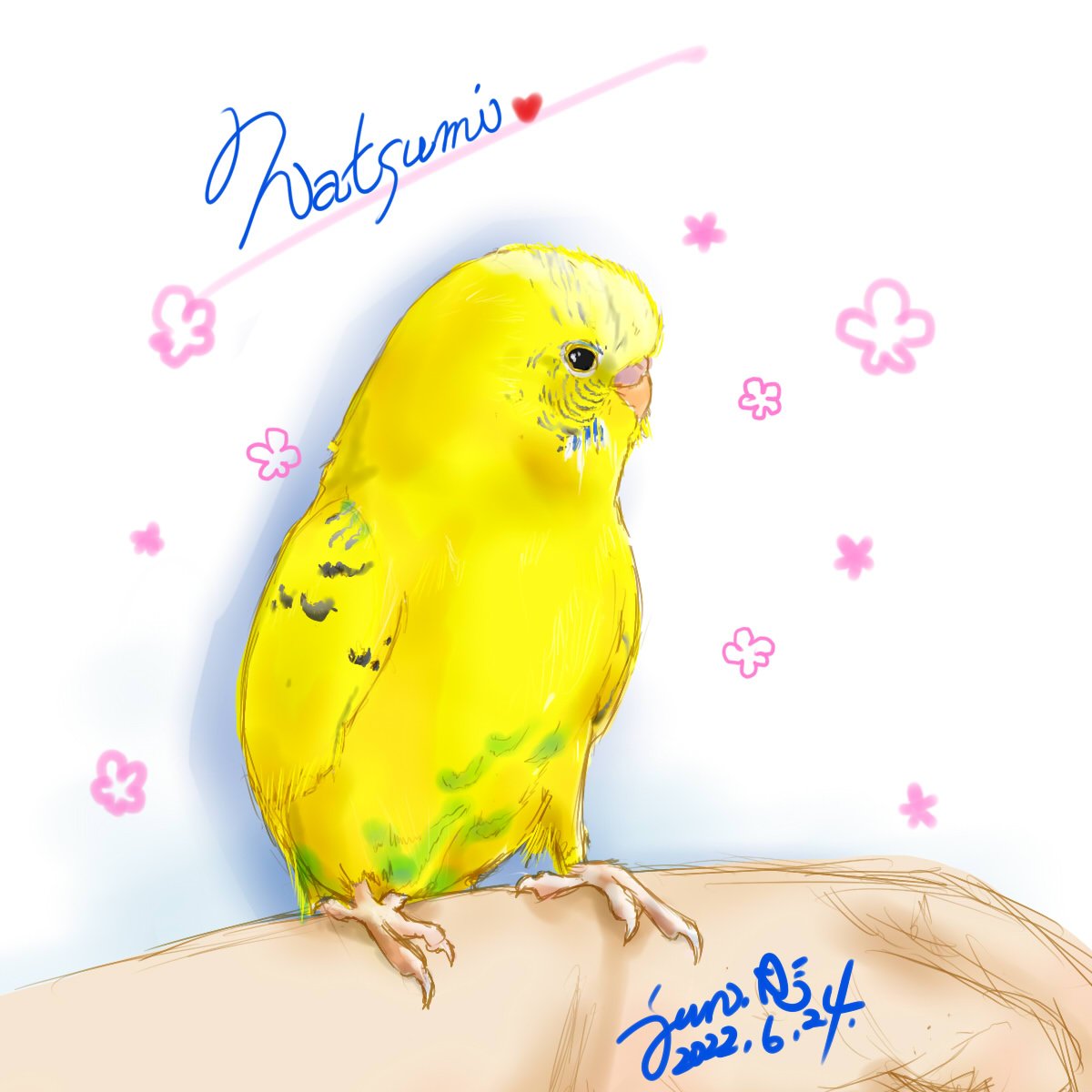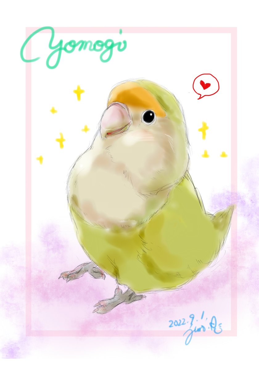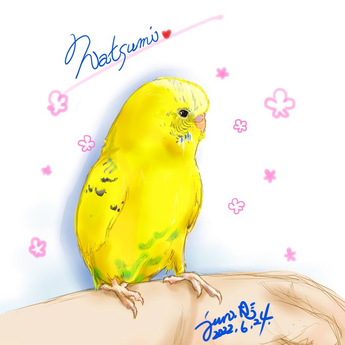 お昼寝したら愛鳥の夢を見た。最近インコちゃんたくさん描いてるから菜摘も仲間に入れてほしかったのかな❓リクエストだと思って描いたぞ~ナツ~見てる⁉️🤗 #セキセイインコ #イエローハルクイン #愛鳥なっちま #イラスト #絵描きさんと繋がりたい