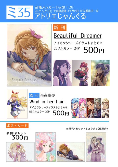 35 55 改めて芸カ28のお品書き告知です。 新刊イラスト本と既刊本、ポストカードセットを頒布します。 色紙も数点ですが仕上げて持っていこうと思いますので後ほどご案内します。 よろしければ【ミ35】にお立ち寄りください #芸カ28 #芸カ28お品書き 23/05/16 23:14