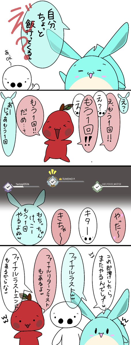 5 59 チームすもも最高でした!! 日増しに練度が上がっていくのが最高にかっこよかったです! 勝手に実質1位はこの3人だと思ってます!! また3人でのAPEX、楽しみにしてますね? 大会お疲れ様でした!!! #すも絵 #そらるの絵 #もこう 21/01/17 22:53