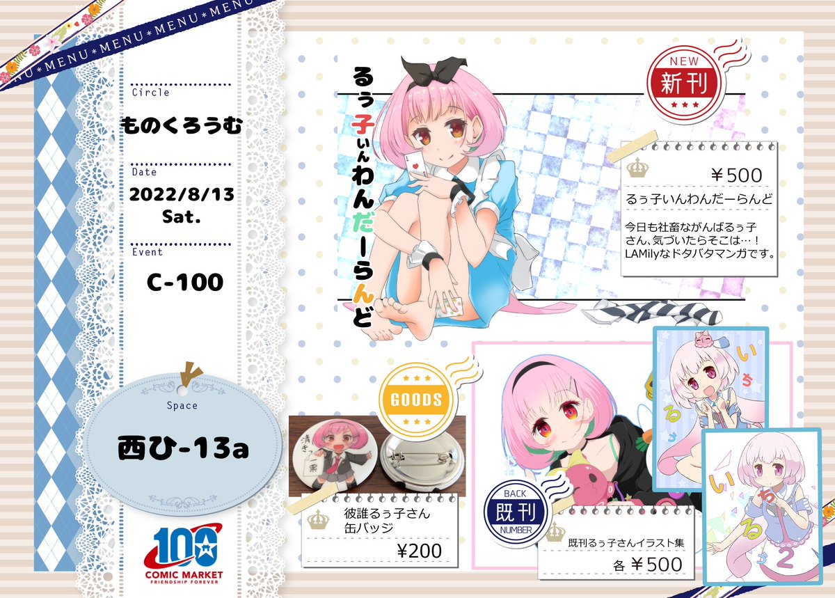 あなたのサークル「ものくろうむ」は、コミックマーケット100で「土曜日西地区 "ひ " 13a」に配置されました!コミケWebカタログにてスペース配置場所公開中です! webcatalog.circle.ms/Circle/Map/162… #C100WebCatalog がんばるぅー!