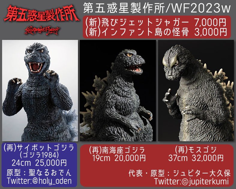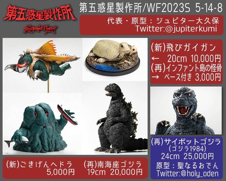 #WF2023S 第五惑星製作所(5-14-8) ラインナップは新作3点、再販2点の合計5アイテムとなりました! 再販のサイボットゴジラと南海座ゴジラは今回で最後なので、そちらもよろしくお願いします!! twitter.com/jupiterkumi/st…