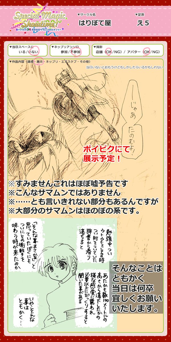8 7 今週末のサマムンwebオンリーにサークル参加します!過去絵展示となります。私は当日不在と思われますが、頑張ってどこかのタイミングでお邪魔していたい(希望)。良かったら遊びにきてください!!このためにポイピクアカ作った! #36thサマムン 23/03/03 22:56