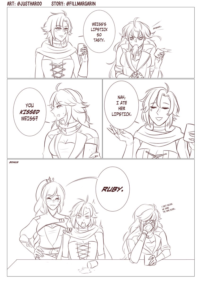 Weiss: it’s not about the lipstick anymore, Ruby. Thanks a lot to @fillmargarin for letting me draw her tweet! #RWBY #RWBYfanart #whiterose #rubyrose #WeissSchnee #yuri