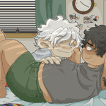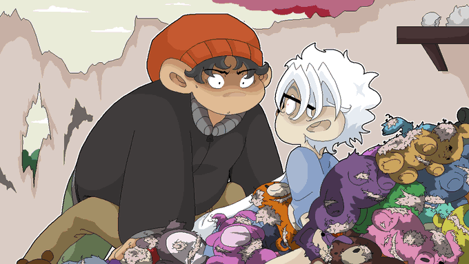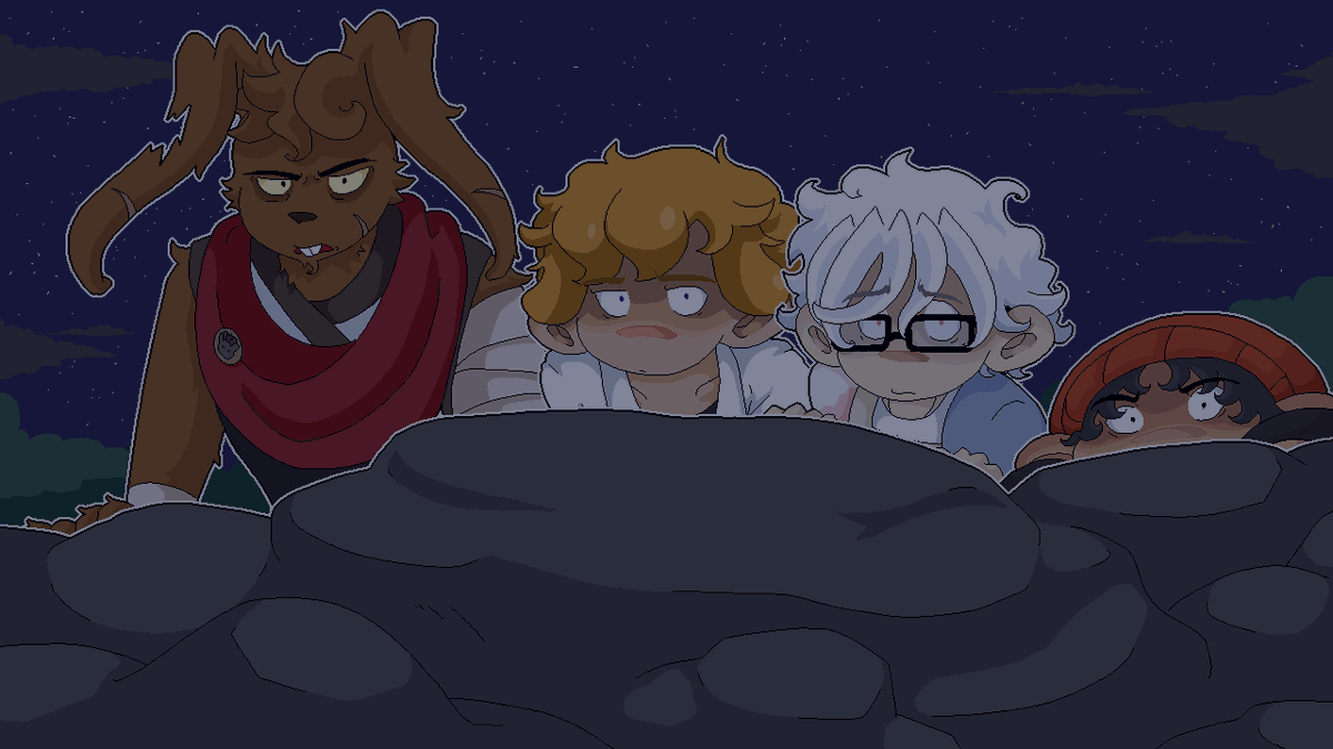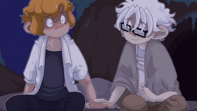 Part 2 will have a few choices leading to completely separate scenes. Like who to have a sweet nighttime chat with during a moment of respite 🤭💕 (This is the Gidgy one obvs. I may be able to be convinced to share the Genzy one next 😏) #visualnovel #indiegame #pixelart