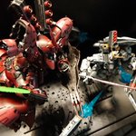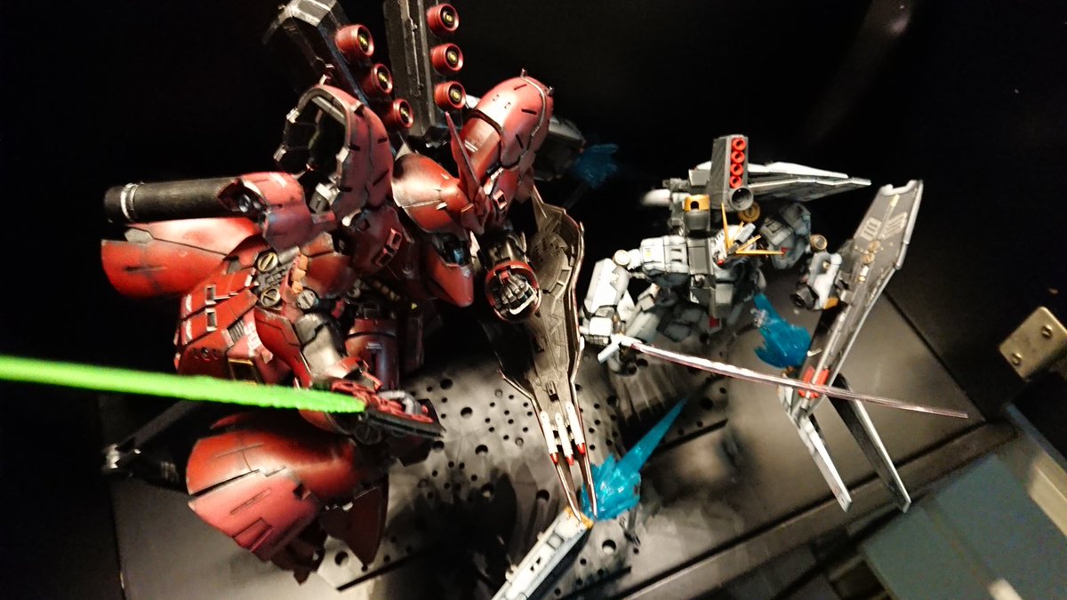 RGνガンダム、完成後のポージング決定‼️ やっとサザビーとツーショットが出来ました😭 念願叶った😭 我が家のコレクションBOXの1等席確保です😤 さぁ、次はどうしようかな・・・ #ガンプラ #ガンプラ好きな人と繋がりたい #ガンプラの画像貼るとRTされると聞いて #RGνガンダム