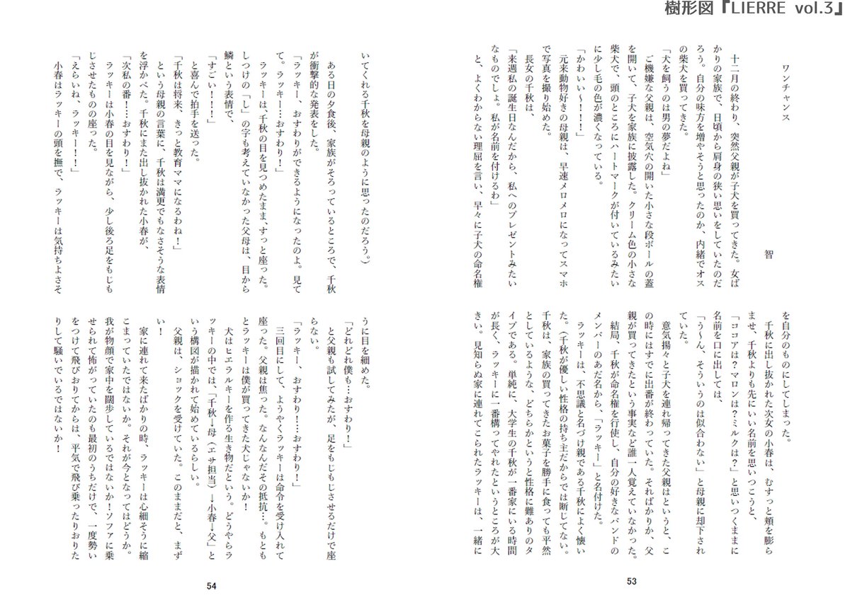 猫が前面に出がちな樹形図ですが、既刊『LIERRE vol.3』では犬が登場する作品も収録しています!!🐶 5月コミティアに持っていきますので、動物ジャンルに関心のある方はぜひ…! #コミティア144 #COMITIA144 #既刊 twitter.com/jyukeizu4/stat…