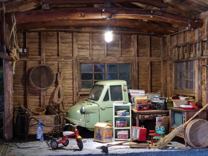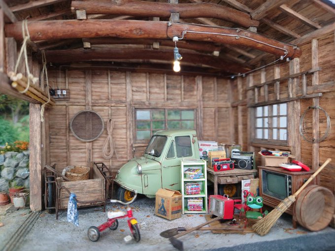 83 387 「想い出眠る納屋」が完成しました。 ふるさとにある古い納屋には、子供の頃を思い出す懐かしい品々が眠っていました。 #ジオラマ #ミニチュア #昭和レトロ 23/01/08 18:22