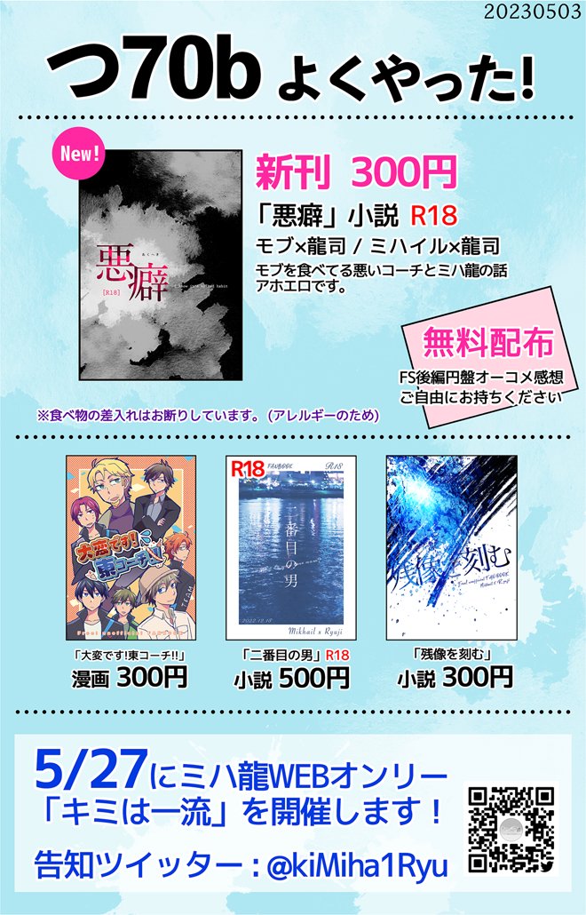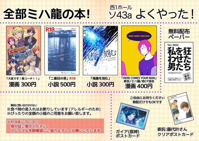 12/18 Splash! お品書きとポスターです ミハ龍の本がいっぱいあります! サンプルはツリーまたはpixivにて 委託の本やポストカードをお預かりしてます(詳細pixivにて) 西1ホール ソ43a「よくやった!」 pixivお品書き↓ pixiv.net/artworks/10363… よろしくお願いします!