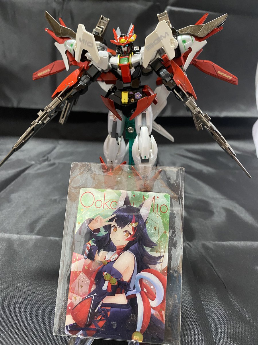 大神ミオ専用ガンダムダブルオースカイメビウス🌲完成🌲カラーリングは初期衣装カラーリングで改造はトランザムブースター付きです。 #ホロリスガンプラ部 #Vtuber専用機 #ホロライブ #ガンプラ #みおーん絵