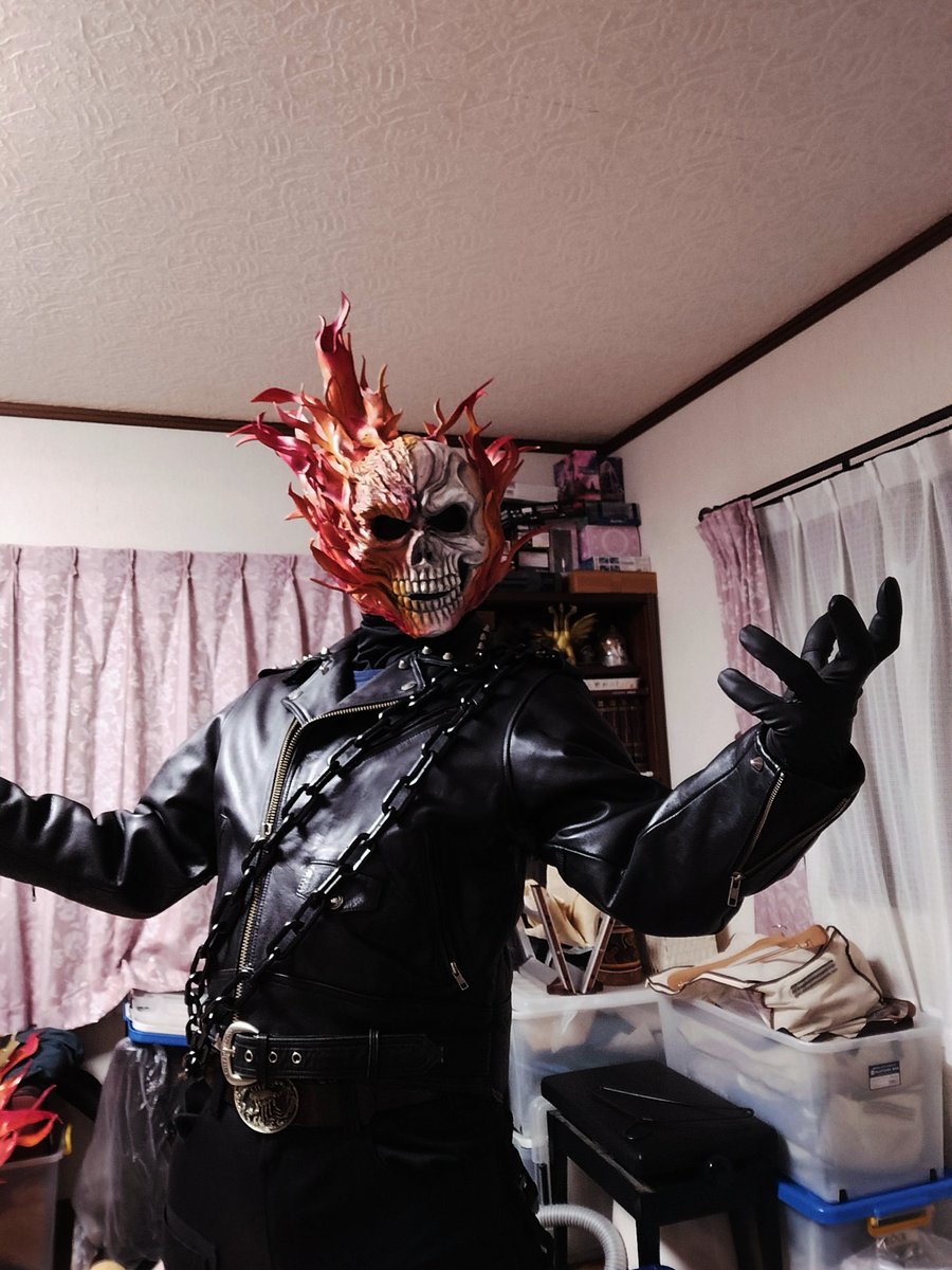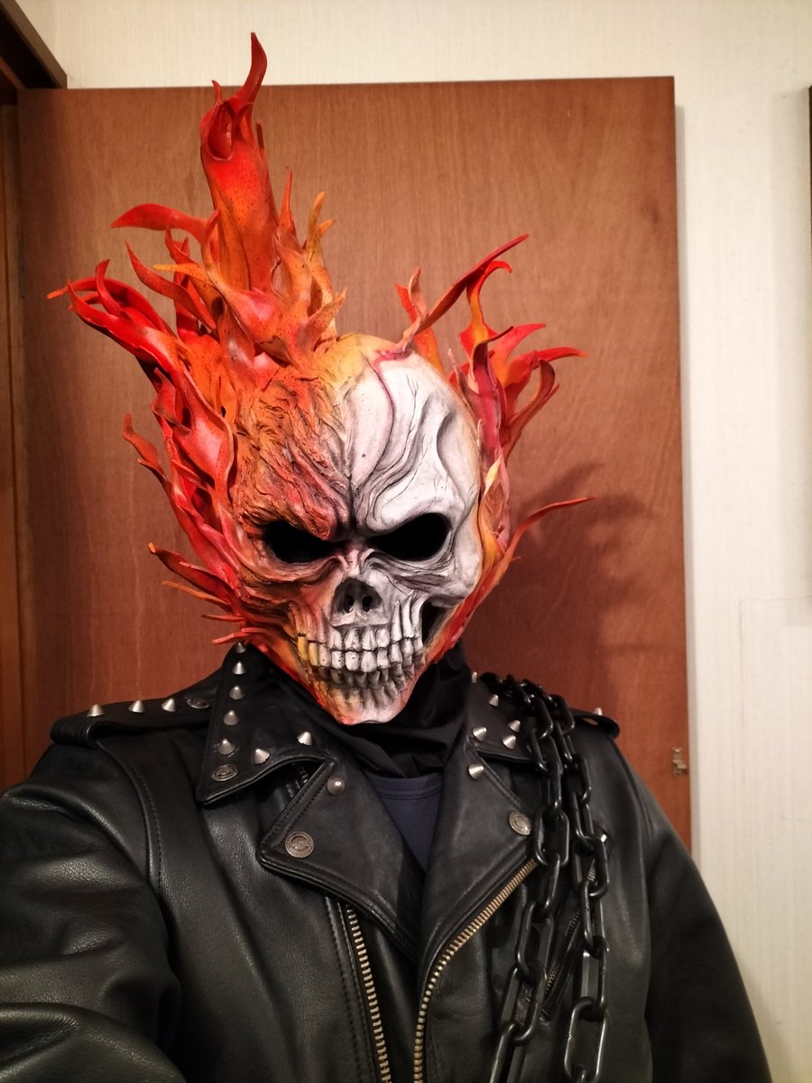 #今年一番気合い入れて作ったコスプレ衣装見せて 今年はゴーストライダーマスク制作だな。炎の感じや髑髏の輪郭を調整したけど一作目は色々と失敗してその後すぐに二代目を作った! 衣装は買ったヤツだけど本皮のレザージャケットを高額購入して一番の出費だったw