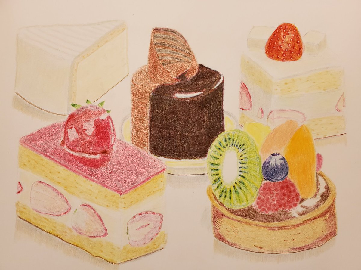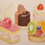 ケーキ盛り合わせ描きました🍰💗 チョコレートケーキの混色頑張りました🍫🎂 #色鉛筆画