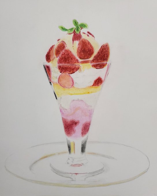 暑くなりましたね〜 いちごのパフェ描きました🍓 #色鉛筆画