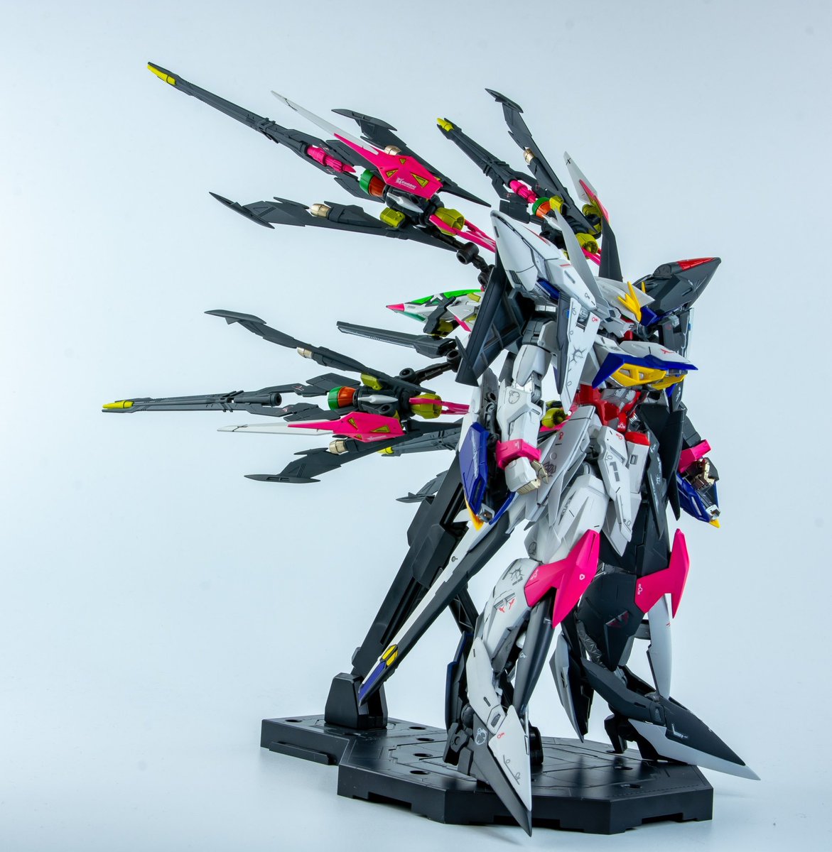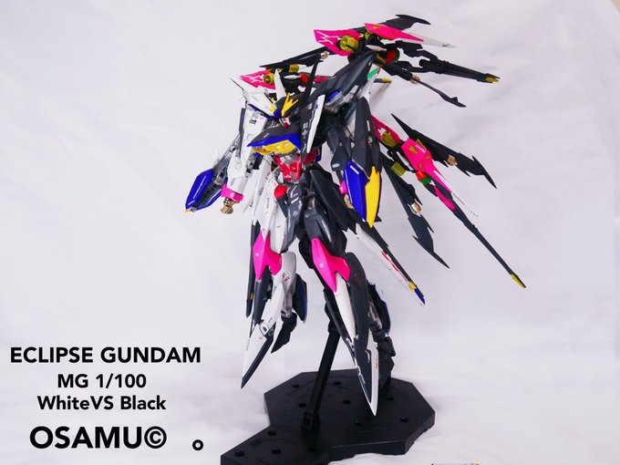 【ECLIPS GUNDAM MG 1/100 】 White×Blackのツートンで仕上げました。 差し色に蛍光色を使用。 一つの機体で天使と悪魔を表現したく挑戦。 表面処理から全塗装、スミ入れ、デカールと丁寧にこだわりました。 約2ヶ月ぶりの完成品です。 #ガンプラ #エクリプスガンダム