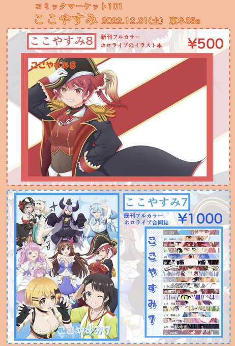 「ここやすみ」は、コミックマーケット101で「土曜日東地区 "ネ " 35a」に配置されました!コミケWebカタログにてサークル情報ページ公開中です! webcatalog.circle.ms/Perma/Circle/1… #C101WebCatalog 個人的な理由で間に合うかわからないのと現地に行けるかわかりませんが、何卒よろしくお願い致します!