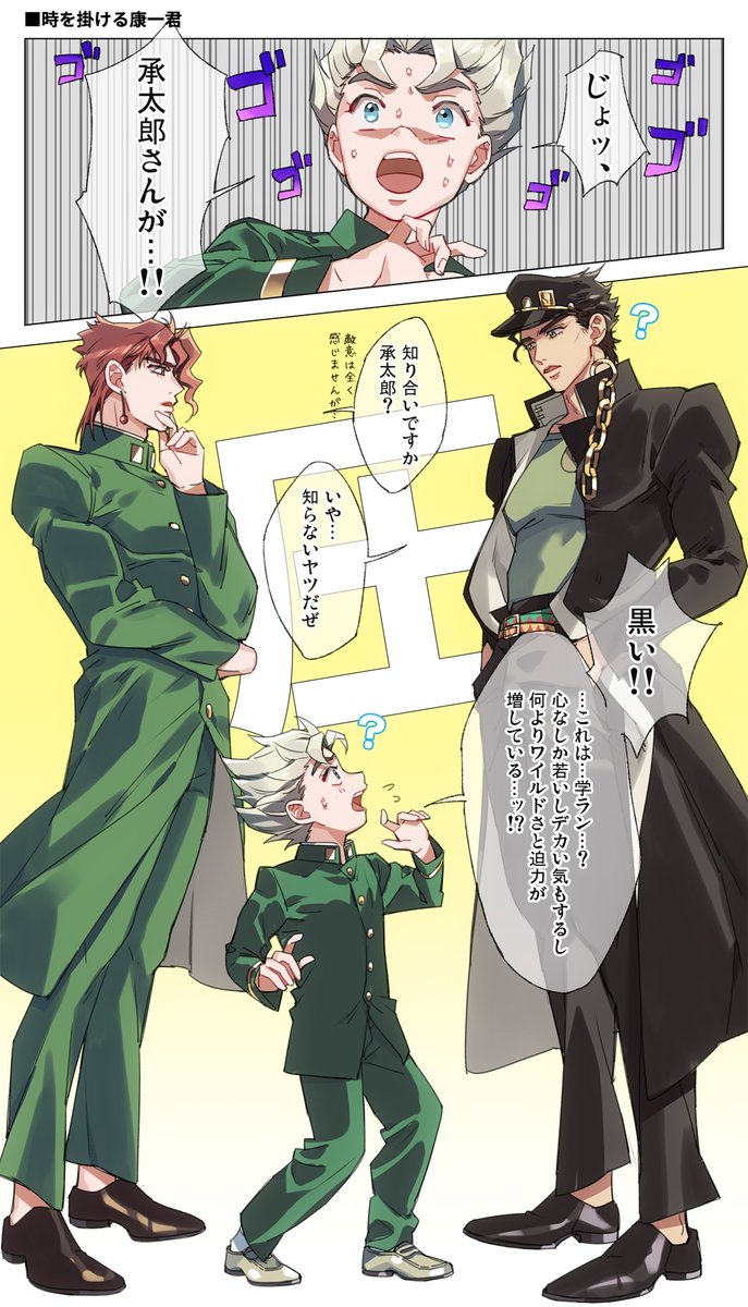JOJO/承+康 今3部アニメ見ている途中という落書き(承太郎さんを描いてみたかっただけなので内容に意味はない) 21話まで見た! 全盛期承太郎さんめちゃくちゃ尖ってる~!!びっくりした!(ジョジョ初心者4部アニメから入りし者🔰)