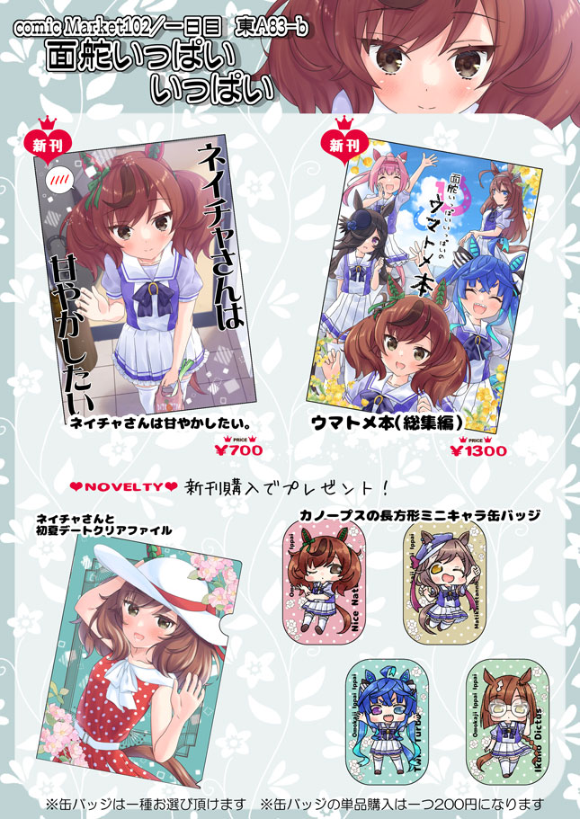 82 189 ◎あなたのサークル「面舵いっぱいいっぱい」は 土曜日 東地区 “A” ブロック 83b に配置されています。 コミックマーケット102、スペースいただけました~!新刊はネイチャさん本等予定です。宜しくお願いします~!! 23/06/09 17:10