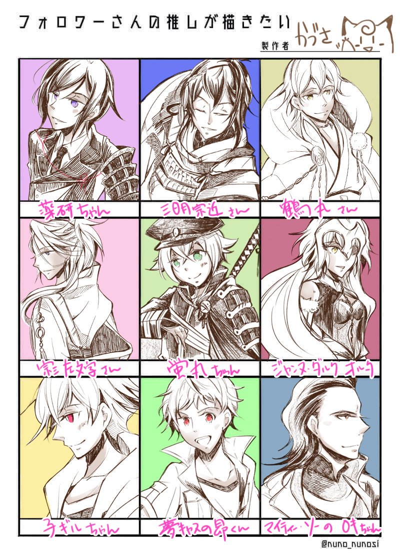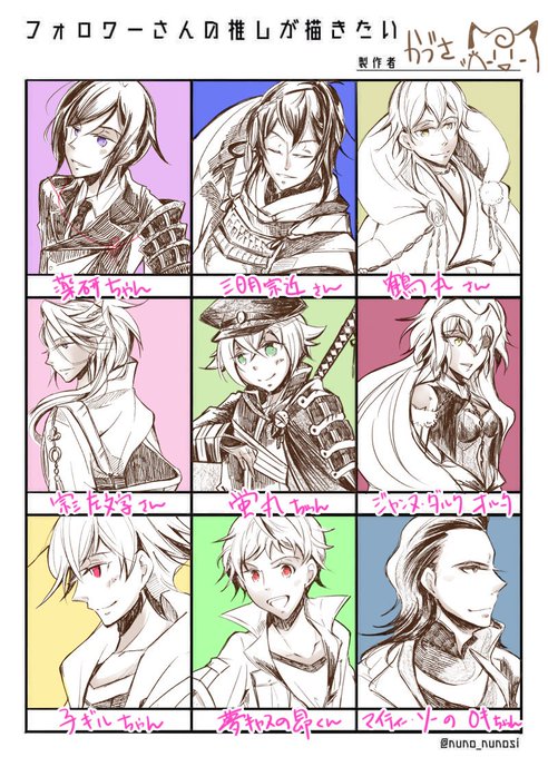 出来ました(о´∀`о)7人の方の推しを描かせていただきました!有り難うございました!ほぼ初描きでぎこちないですが色々描けて楽しかったです✨ 余った2枠は私の推しの子ギルちゃんと鶴丸さんです😌 #フォロワーさんの推しが描きたい