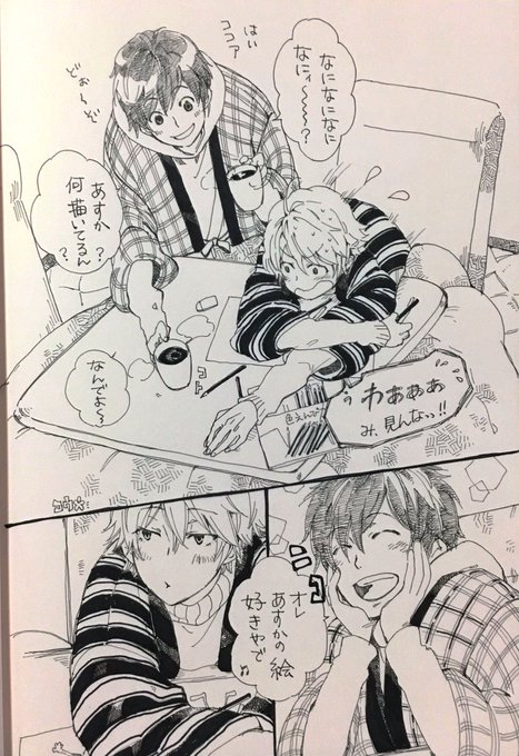 こたつ良いですよね😊 冬はこたつ!最高です! こたつで次のステージ衣装デザイン考え中(?)な飛鳥くん…に、こたつにヌクヌクしにきた苺ちゃん…とか😊 #あすかなアート