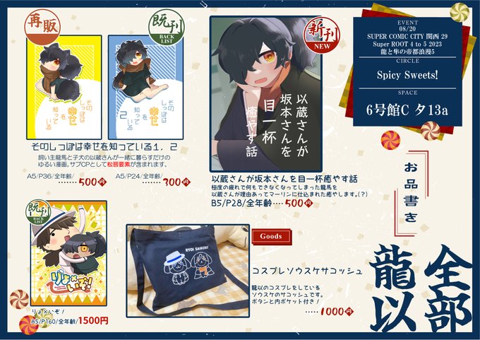 前日ギリギリですみません~!! 明日の【SUPER COMIC CITY 関西 29 Super ROOT 4 to 5 2023夏 龍と隼の帝都浪漫5】のお品書きになります。 明日は【6号館C タ13a】にてお待ちしております~!! #龍と隼の帝都浪漫5