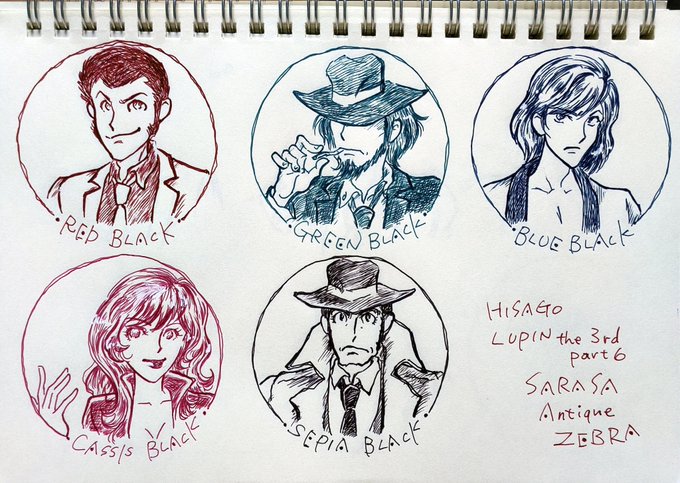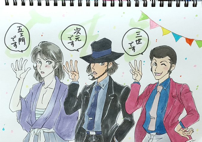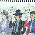 「地獄へルパンを道づれ」良かった! ルと次は勿論のこと、ろくでもない話を持ってくる不ちゃん、危うい事には不参加ながらちゃんとお迎えにくる五、ルへの初恋を拗らせたトランスジェンダーのレディブラックと彼女に使える老執事。そして張込みしつつ一人ピクニックの警部! #fanart #イラスト練習