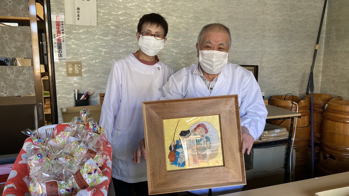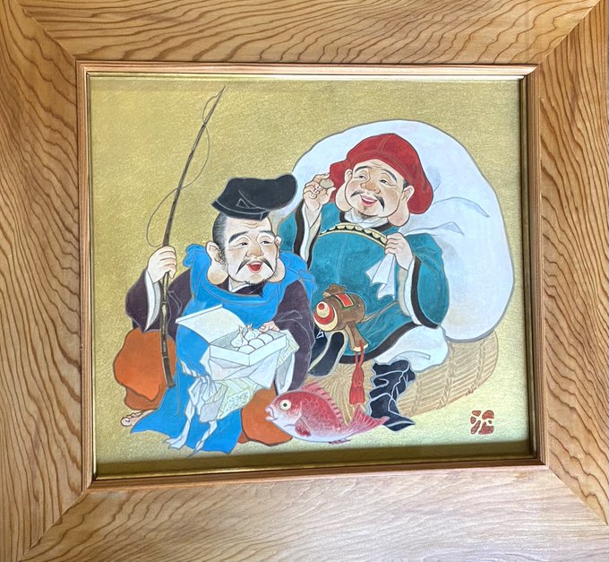 子供の頃から可愛がっていただいている、地元の和菓子屋・おとめ餅さん。 恵比寿さん大黒さんの絵を注文いただき、描きました。 手にしているのは、この季節の名菓・栗きんとん🌰 恵比寿大黒さんも、小槌や鯛を置いて手に取る美味しさです! おとめ餅本舗 0572-55-2280 maps.app.goo.gl/4CvyW4yo15BEh1…