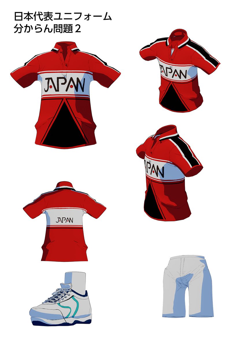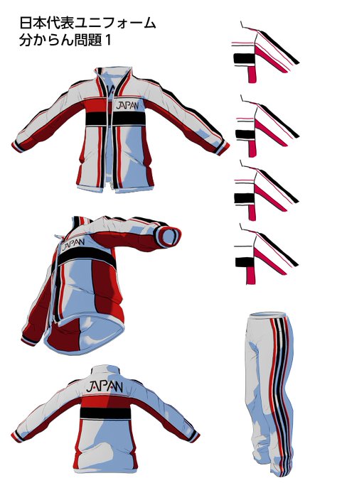 日本代表ユニフォーム分からん問題。 分からなすぎて3Dを作ったけど、結局よく分からなかったよ。同じ媒体でも省略されたり、違ったりするから、もう好きに描けばいいよ(結論)