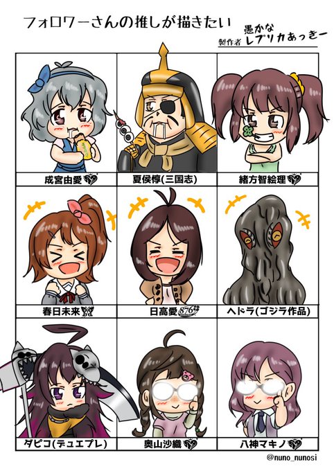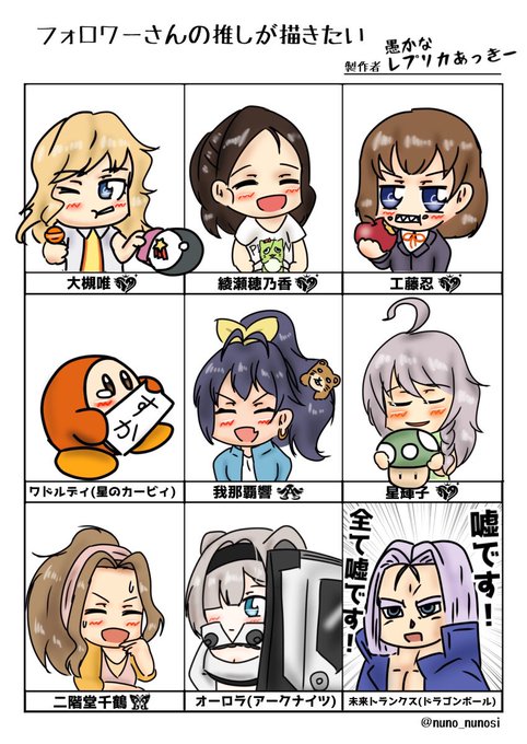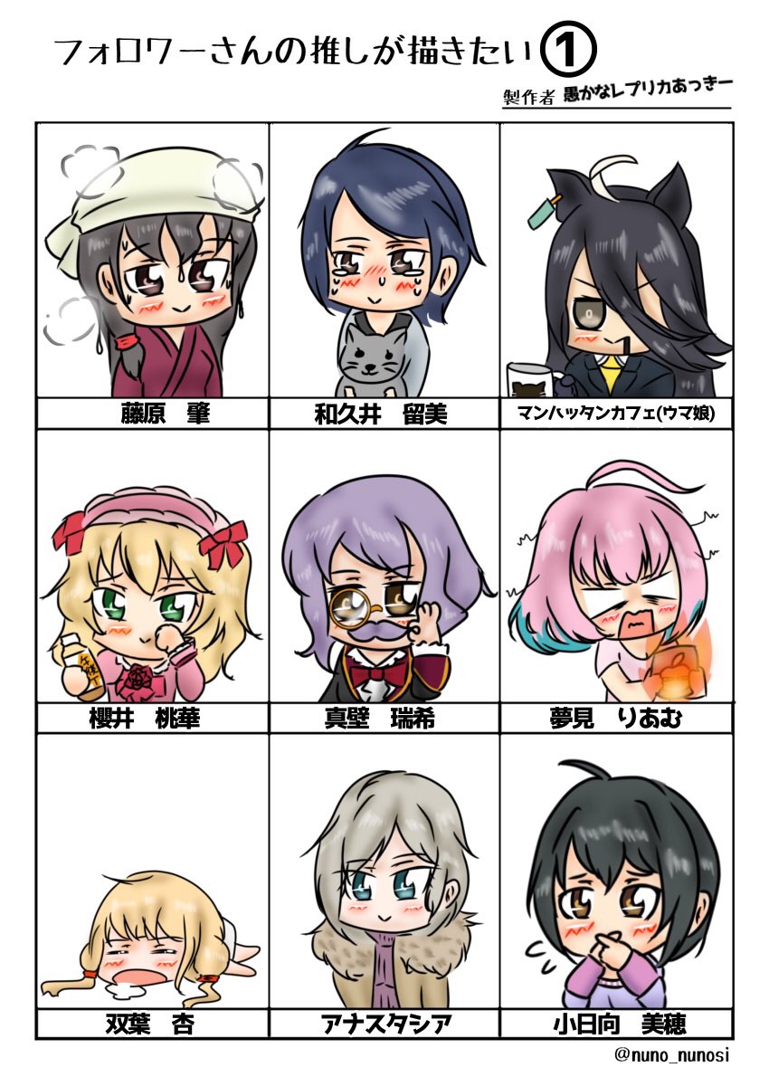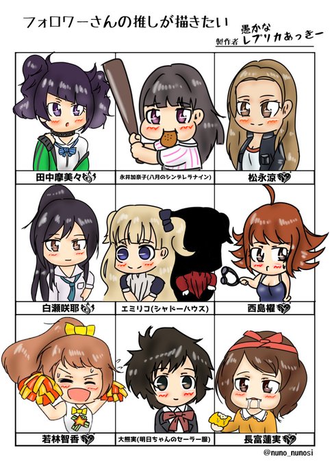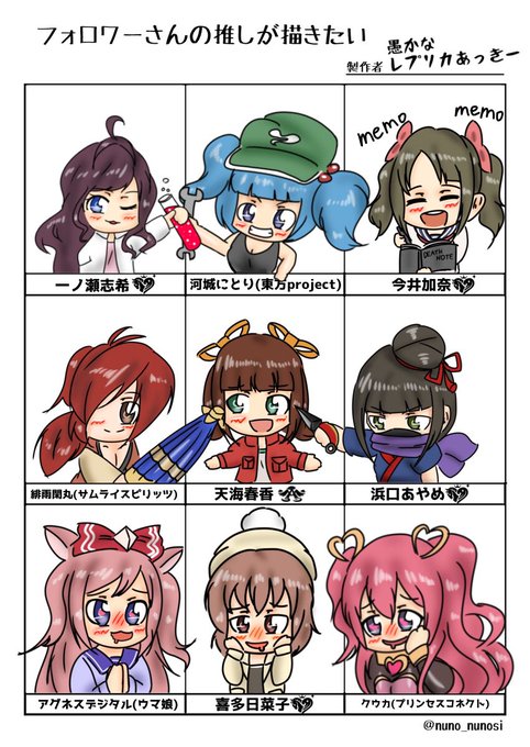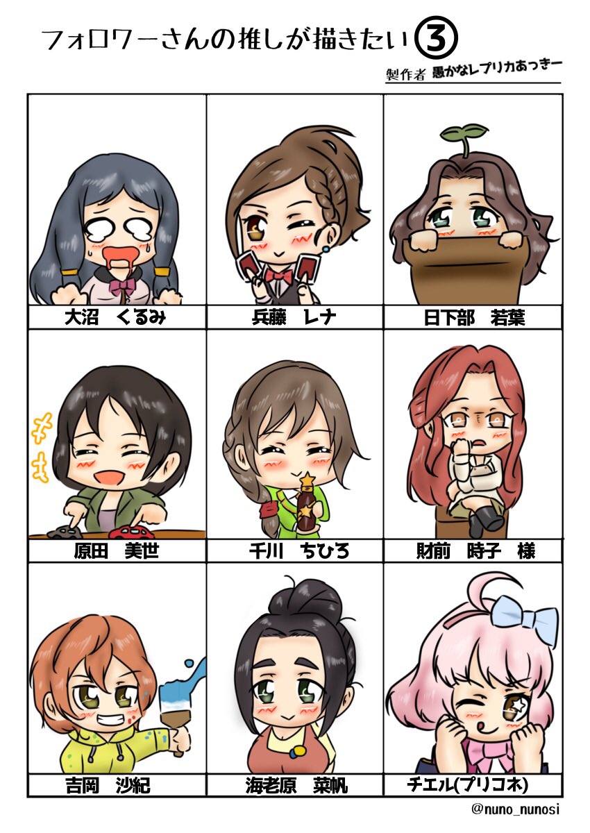 #フォロワーさんの推しが描きたい 見聞を深めるためまた募集します どなたでもリクエストくださいまし ・アイマスでもアイマス以外でも大丈夫です ・前回と被っても大丈夫です ・9人超えても引き続き募集します ・6/30(金)いっぱいくらいで〆ます ・アイマス以外でも大丈夫です ↓添付は前回の