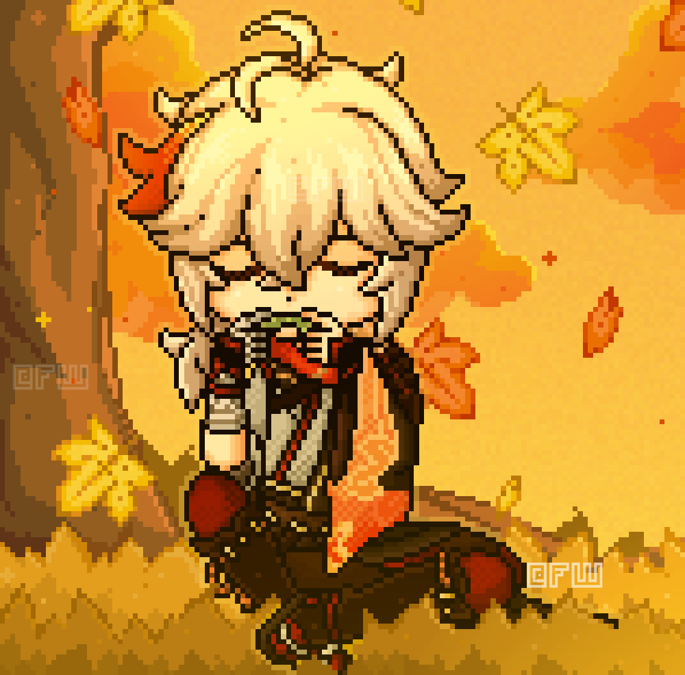 This scenery is wonderful... Surely enough to convince anyone to become a wanderer... 🍁🍃 #kazuha #KaedeharaKazuha #pixelart #genshinimpactfanart #GenshinImapct #anemo