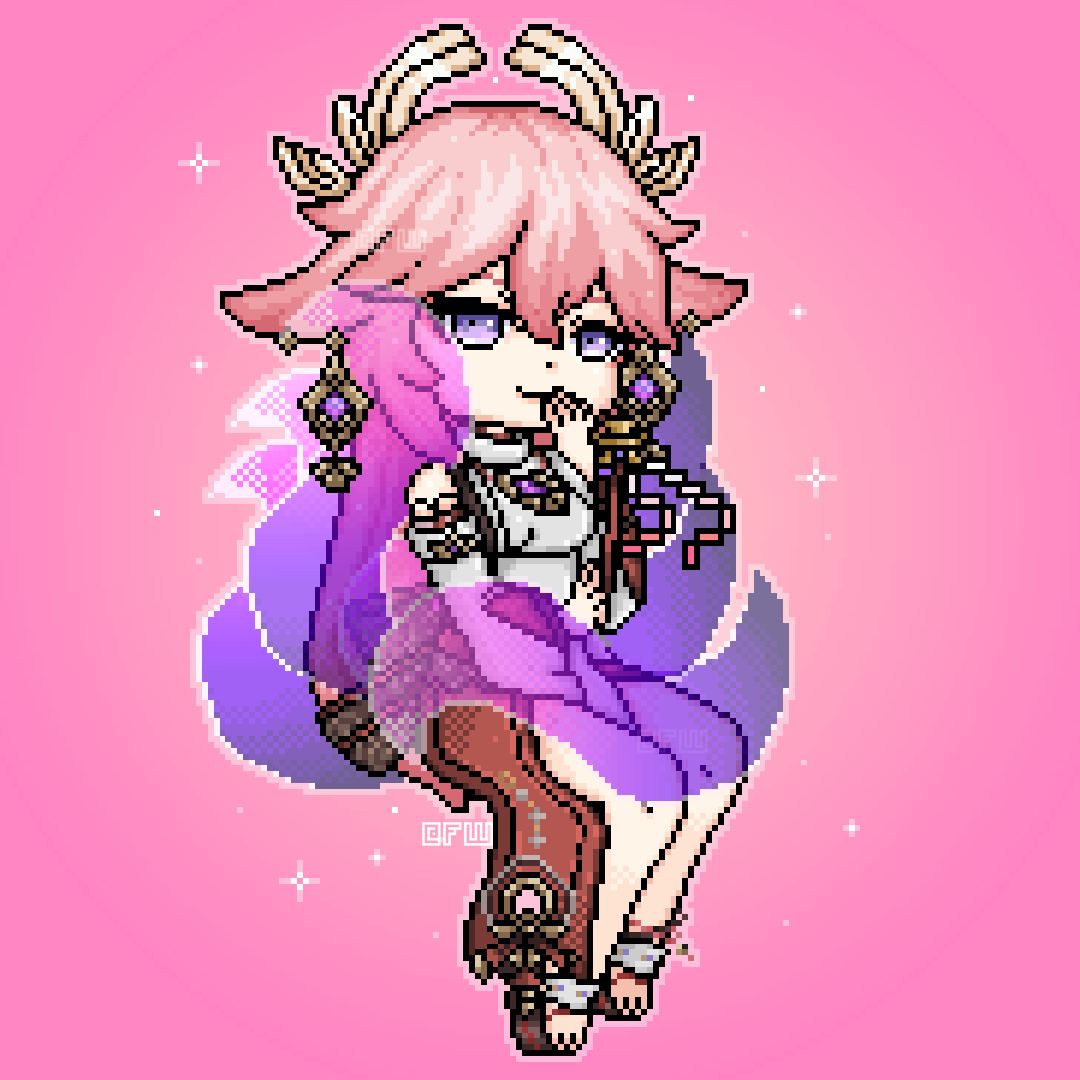 Welcome to Naganohara! My name is Yoimiya — just let me know if you need anything! (ノ´ヮ`)ノ*: ・゚ #genshinimpact #genshinimpactfanart #Yoimiya #pyro #fireworks #pixelart #pixelartist