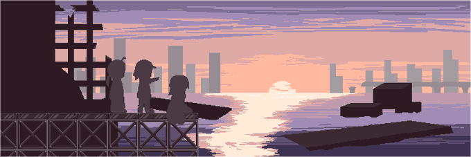 ドット絵 沈まぬ夕陽に照らされる町 #ドット絵