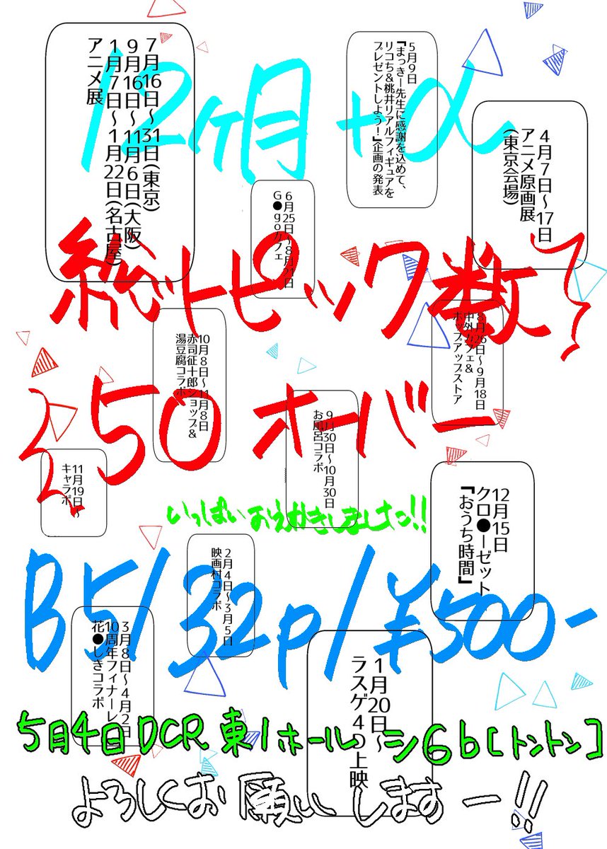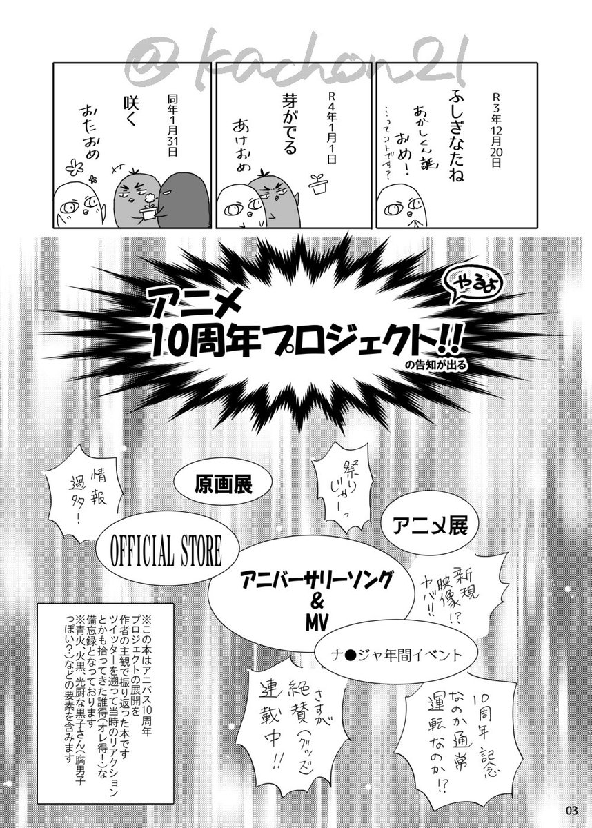 【5/4 DCR 新刊サンプル1/2】 『10th Anniv Memories-アニバス10周年プロジェクト備忘録-』B5/32p/500円予定です! 10周年プロジェクト告知から後夜祭までを作者の主観で月毎に振り返った、絵日記みたいな備忘録となっております(°▽°) よろしくお願いします!!