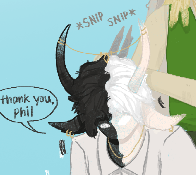 detail sketch inspired by tweets from @stackablebells ,, where c!Phil is the only one on the SMP who knows how to cut hair, and gives c!Ranboo a snip (rts appreciated!) <ignore the fact I was too tired to draw faces>#ranboofanart #philzafanart #dreamsmpfanart
