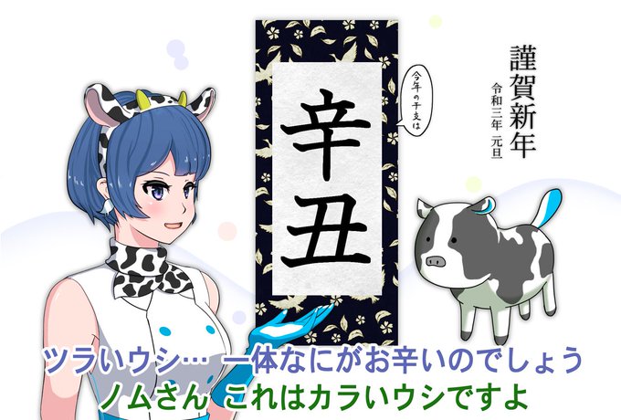 今年の干支は、辛丑! ツラいウシ……一体なにがお辛いのでしょう。 ノムさん、これはカラいウシですよ。 あらー、そうでしたかー。お料理ですわね。wwww (どっちも違います。) #ノムart #あけましておめでとうございます #今年もゆっくり自分のペースで #牛だけに