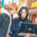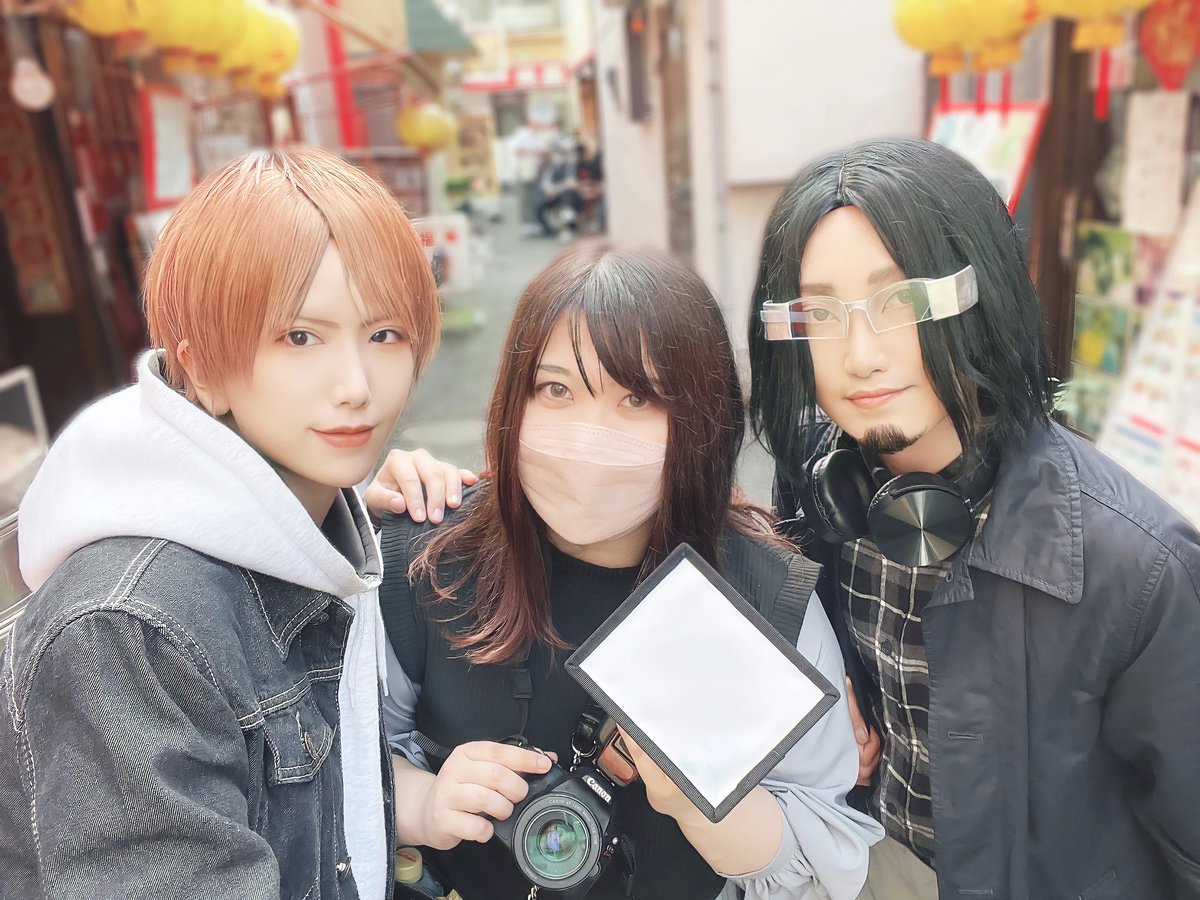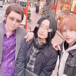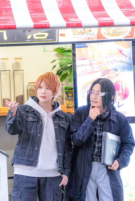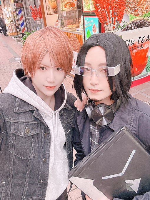 [コスプレ/ロストジャッジメント] 東さんと!! しきさんの東さんにずっとお会いしたかったので夢のようでした😍 九十九君サンドした😘🕶💻🎭 東さん(@shikishimania4 ) 九十九君(@fry_pan )
